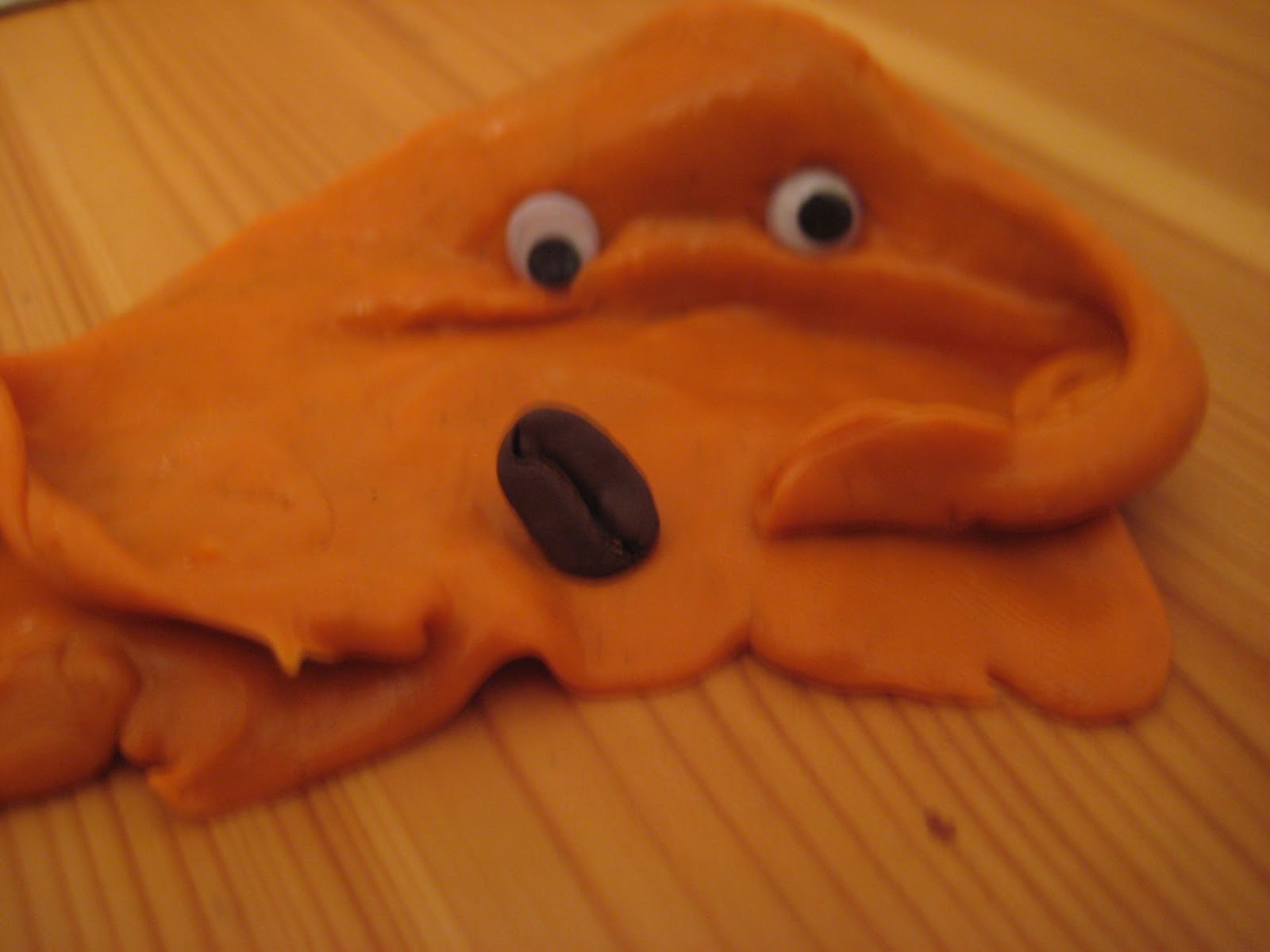 Plötzlich aber drehte sich unsere tapfere und superschlaue Kaffeebohne um und sprang dem verdutzten Hüpfknetemonster (Juhu, Überraschungseffekt auf unserer Seite!) mitten auf dem Kopf, sodass es einknickte und dann bearbeitete sie das orangefarbene Wesen mit weiteren Hieben und Tritten (ja, wir wissen, Kaffeebohnen haben keine Beine, na und...?), bis es nur noch ein einfacher Klumpen Hüpfknete (okay, immernoch krebserregend!) war. Auch wenn keine Journalisten oder andere Schaulustige zu sehen waren, stellte sich unsere Kaffeebohne triumphierend auf den Haufen, der, gaaaanz wichtig, orange und nicht etwa braun war!, und da wir einfach mal total allwissend sind, waren wir sofort zur Stelle und konnten ein Siegesfoto schießen, im Gegensatz zu den anderen angeblich rasenden Reportern, die natürlich alle wieder zu spät kamen. Leider ist es im ganzen Trubel verschütt gegangen, wie man so schön sagt, aber dafür haben wir aus vertraulichen Quellen noch ein "Vorher"-Foto erhalten: